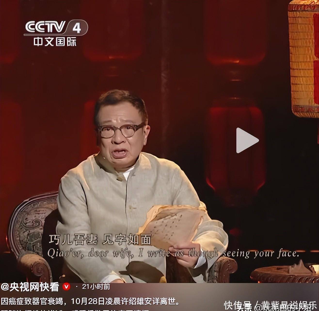 央媒发文悼念许绍雄,文案信息量大,最后一条视频忠告看哭网友 最近许绍雄老师走了,好多人都特别难过。你看网上,不管是普通网友还是明星,都在悼念他,连央视都专门夸他,说他这一辈子虽然大多演配角,但每一个角色都特别用心。 其实许绍雄老师除了演技好,还有些事儿可能好多人不知道。之前央视网发过一个他读侨批的视频,他穿着中式衣服坐在书斋里,读那些海外游子写的信,语气特别有感情,连眼神里都带着对家乡的思念,看得人心里暖暖的。而且他读不同信的时候,语气节奏都不一样,一看就是下了功夫的。